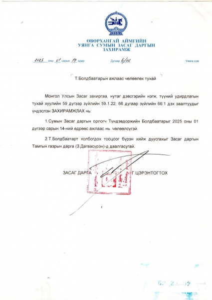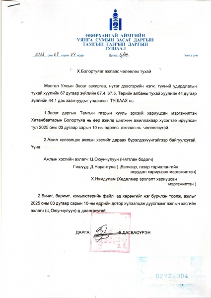 ЗАСАГ ДАРГЫН ТАМГЫН ГАЗРЫН НЯРАВЫН СУЛ ОРОН ТООНД АЖИЛТАН СОНГОН ШАЛГАРУУЛЖ АВНА.