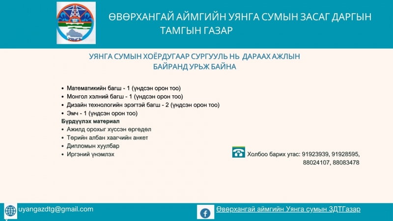 Сумын Засаг даргын Тамгын газрын Хууль, эрх зүй, дотоод ажил хариуцсан мэргэжилтний сул орон тоог нөхөх тусгай шалгалтын зартай танилцана уу.